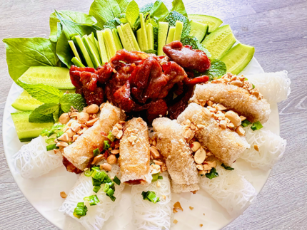 Grilled Pork with Steamed Rice Vermicelli Bundles and spring rolls